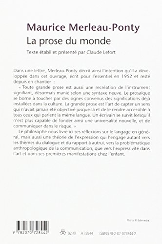 La prose du monde Maurice Merleau-Ponty livre - La prose du monde a été écrit par Maurice Merleau-Ponty qui connu comme un auteur et ont écrit beaucoup de livres intéressants avec une grande narration. La prose du monde a été l'un des livres de populer sur 2016. Il contient 238 pages et disponible sur format . Ce livre a été très surpris en raison de sa note rating et a obtenu environ avis des utilisateurs. Donc, après avoir terminé la lecture de ce livre, je recommande aux lecteurs de ne pas sous-estimer ce grand livre. Vous devez prendre La prose du monde que votre liste de lecture ou vous serez regretter parce que vous ne l'avez pas lu encore dans votre vie.Rang parmi les ventes Amazon: #83212 dans LivresPublié le: 1992-11-10Langue d'origine: FrançaisDimensions: .51" h x 4.88" l x 7.48" L, Reliure: Poche238 pagesPrésentation de l'éditeurDans une lettre, Merleau-Ponty décrit ainsi l'intention qu'il a développée dans cet ouvrage, écrit pour l'essentiel en 1952 et resté depuis en chantier : "Toute grande prose est aussi une recréation de l'instrument signifiant, désormais manié selon une syntaxe neuve. Le prosaïque se borne à toucher par des signes convenus des significations déjà installées dans la culture. La grande prose est l'art de capter un sens qui n'avait jamais été objectivé jusque-là et de le rendre accessible à tous ceux qui parlent la même langue. Un écrivain se survit lorsqu'il n'est plus capable de fonder ainsi une universalité nouvelle, et de communiquer dans le risque." Le philosophe nous livre ici ses réflexions sur le langage en général, mais aussi une théorie de l'expression qui l'engage autant vers les thèmes du dialogue et du rapport à autrui, vers la problématique anthropologique de la communication, que vers l'expressivité dans l'art et dans ses premières manifestations chez l'enfant.Biographie de l'auteurNé à Rochefort en 1908, Maurice Merleau-Ponty, ancien élève à l'École normale supérieure, agrégé de philosophie, docteur ès lettres en 1945, professeur à la Sorbonne, puis au Collège de France depuis 1952, est mort en 1961. Il a été membre du comité directeur des Temps modernes depuis leur fondation.